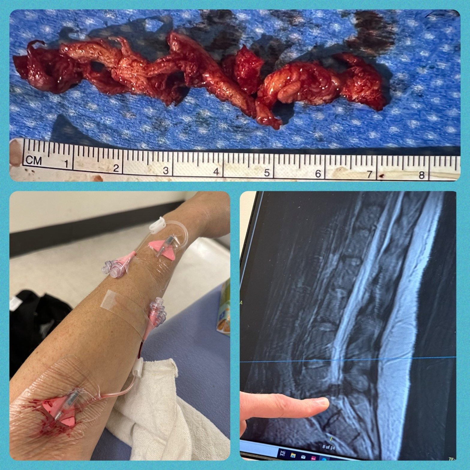 Dr. Lambert came down and told me that they removed 8 cm or about 3 inches of tissue from my spine and that they needed to make two incisions.  He explained that I had a pump in my back to drain the blood from my body and that he would check in on me in the morning.