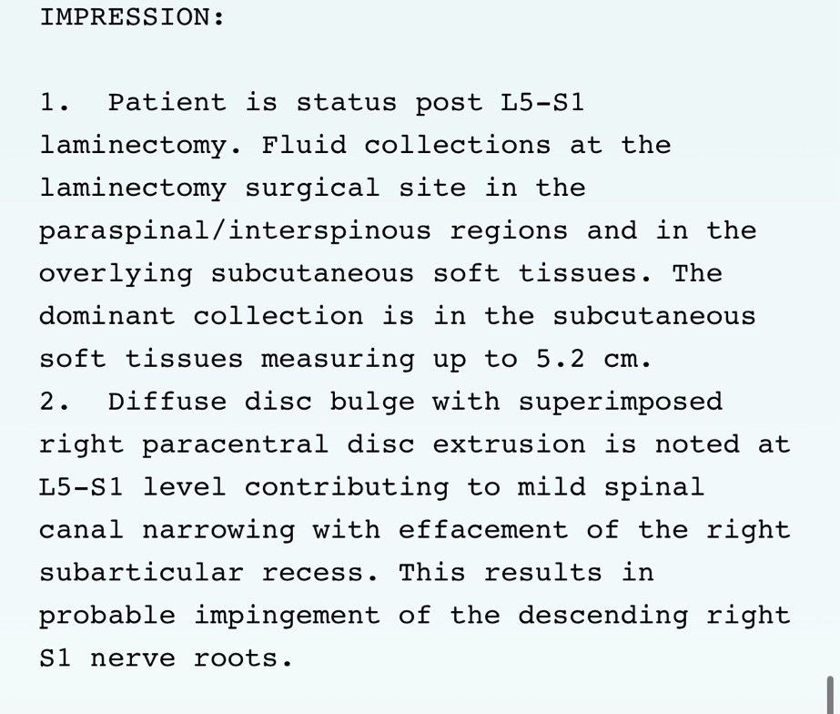 He seemed to start backtracking so I asked him flat out if I had it. He said that I should defer to the spinal team. The ones that told me my MRI LOOKED OKAY. To make a long story short, the radiology resident typed up a finding of Arachnoiditis, the attending ER doctor read it and called the Neurology team to report out. Meanwhile, the attending radiologist amended the report after not seeing Arachnoiditis (thank you God, that is the power of prayer 🙏🏻). Overall, my MRI looked better and showed no herniation.