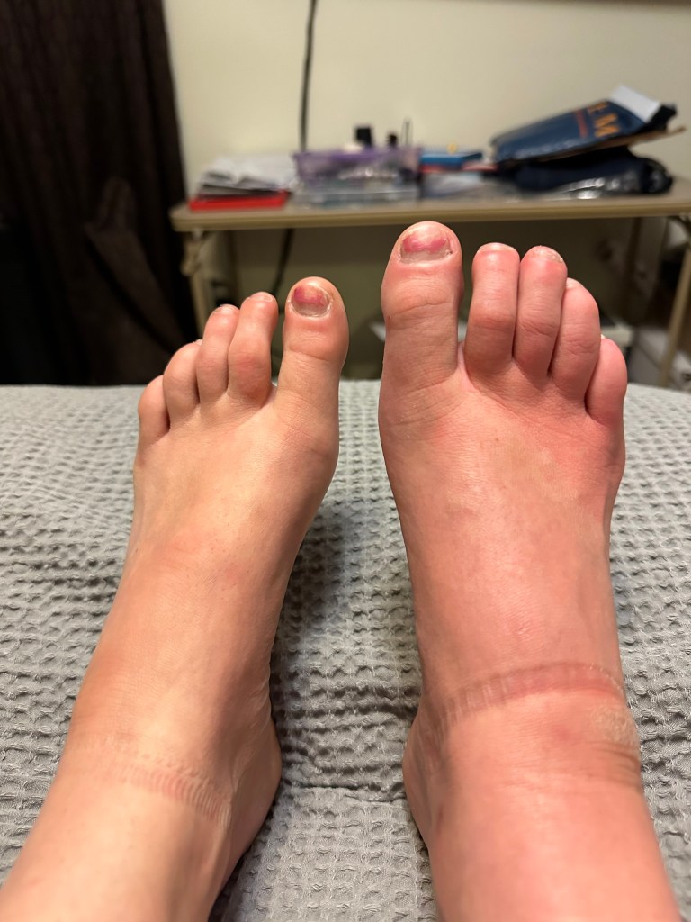The nerve pain medication made a slight difference but I was still struggling with pain, numbness, throbbing, and limited sitting and standing. After I tried to stand for a period of time and meal prep, I suddenly got searing pain in my right foot that brought me to my knees. It was hot, searing pain and I couldn’t even touch my foot to the ground. I dragged myself to the couch and took some of the dreaded painkillers. It was excruciating. When I took off my socks my right foot was extremely swollen.